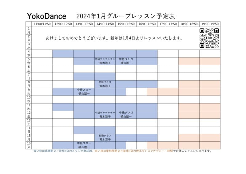 2024年6月のグループレッスン予定表です。今月からJR横浜線成瀬駅から徒歩3分のヨコヤマダンススタジオにレッスン場所が移ります。ただし、金曜日のグループレッスンの... -