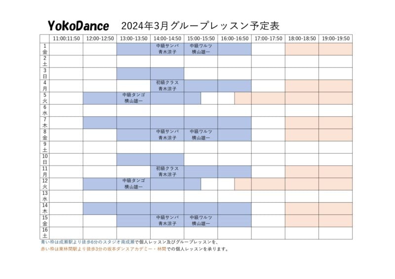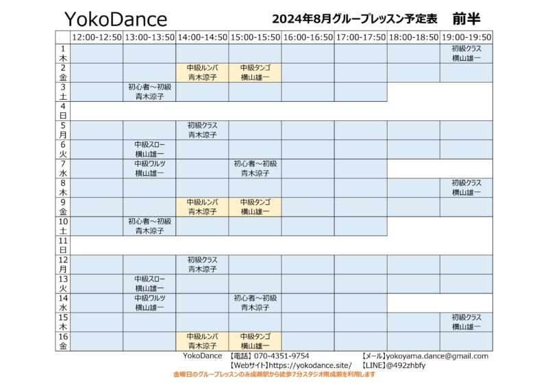 2024年8月のレッスン予定表となります。青い枠はヨコヤマダンススタジオにて、黄色枠はスタジオ南成瀬にてレッスンいたします。8月は次回のパーティーや競技会に向けて... -