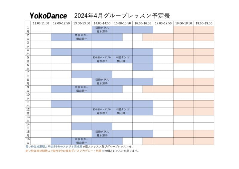 2024年4月のグループレッスン予定表です。青枠の時間はスタジオ南成瀬におります。見学も随時承ります。 -